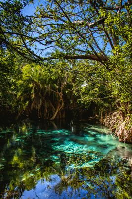 Les eaux bleues limpides de Kikuletwa coulent à une température de 27°C, entourées de palmiers et de racines de figuiers.