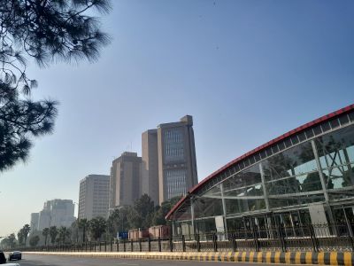 L'Avenue Jinnah traverse le quartier central des affaires d'Islamabad, avec de larges routes bordées d'immeubles commerciaux et de bureaux gouvernementaux.