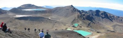 Les deux lacs émeraude sous le cratère Rouge tirent leurs teintes turquoise vives de minéraux lessivés par les bouches thermales environnantes. À proximité se trouve le lac Bleu (Rotopounamu), sacré pour les Māori et où la baignade ou le prélèvement d'eau est strictement interdit. Par temps clair, le mont Taranaki à l'ouest et le mont Ruapehu sont visibles depuis plusieurs points de l'itinéraire.