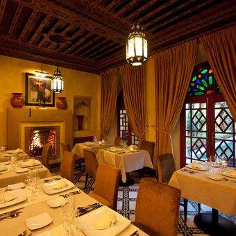 Restaurants établis dans des riads et palais de Marrakech offrant des plats marocains traditionnels et des créations culinaires internationales. Ces adresses présentent la gastronomie locale dans des bâtiments historiques de la médina, avec des terrasses donnant sur la ville et des salles décorées de mosaïques traditionnelles. La carte inclut des tajines, couscous et pastillas ainsi que des spécialités méditerranéennes, asiatiques et européennes.