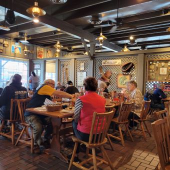 Cracker Barrel est un restaurant à table et une boutique de vente au détail à Clive, dans l'Iowa, où les clients peuvent manger des plats typiques du Sud américain et parcourir une épicerie-bazar proposant des produits alimentaires, des cadeaux et des articles de maison. La boutique occupe la partie avant du bâtiment, et les clients la traversent pour rejoindre la salle à manger.