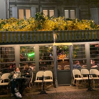 L'Éclair est un restaurant avec bar rue Cler combinant un comptoir moderne pour les boissons et repas rapides avec des tables ordinaires pour un repas complet. L'espace s'écoule naturellement des zones debout aux sections assises, servant les clients occasionnels comme ceux qui cherchent à manger tranquillement.