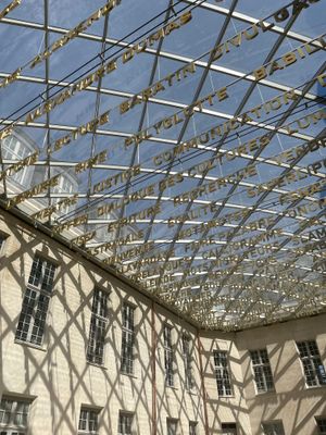 Une salle présente un plafond décoré de mots soigneusement sélectionnés par une collaboration entre linguistes, historiens et habitants locaux. Cette approche collaborative est inhabituelle et montre comment différentes personnes voient et comprennent le langage à leur manière.