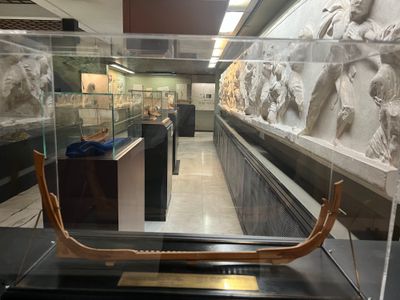 La collection comprend des casques grecs antiques, des maquettes de navires de guerre byzantins et une épée d'enfant de la période ottomane des Balkans.