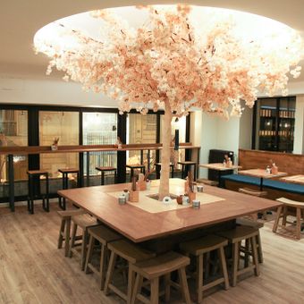 Le deuxième étage comporte un cerisier japonais comme pièce centrale qui attire l'oeil. La terrasse d'été utilise des arrangements de bambou pour créer des zones de repas séparées.