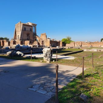 Le Palatino est un site archéologique et une destination touristique sur la colline du même nom à Rome, où des ruines de palais, temples et résidences d'époque antique sont parsemées sur le terrain. Le site s'étend sur plusieurs niveaux et contient des vestiges de murs, de colonnes et de chambres souterraines qui témoignent de la vie urbaine ancienne.