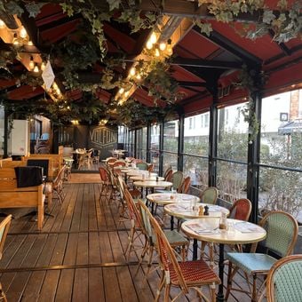 Le restaurant dispose d'une terrasse exterieure chauffee ou manger dehors. Les reservations sont recommandees, particulierement le week-end, pour assurer une place.