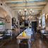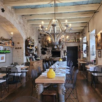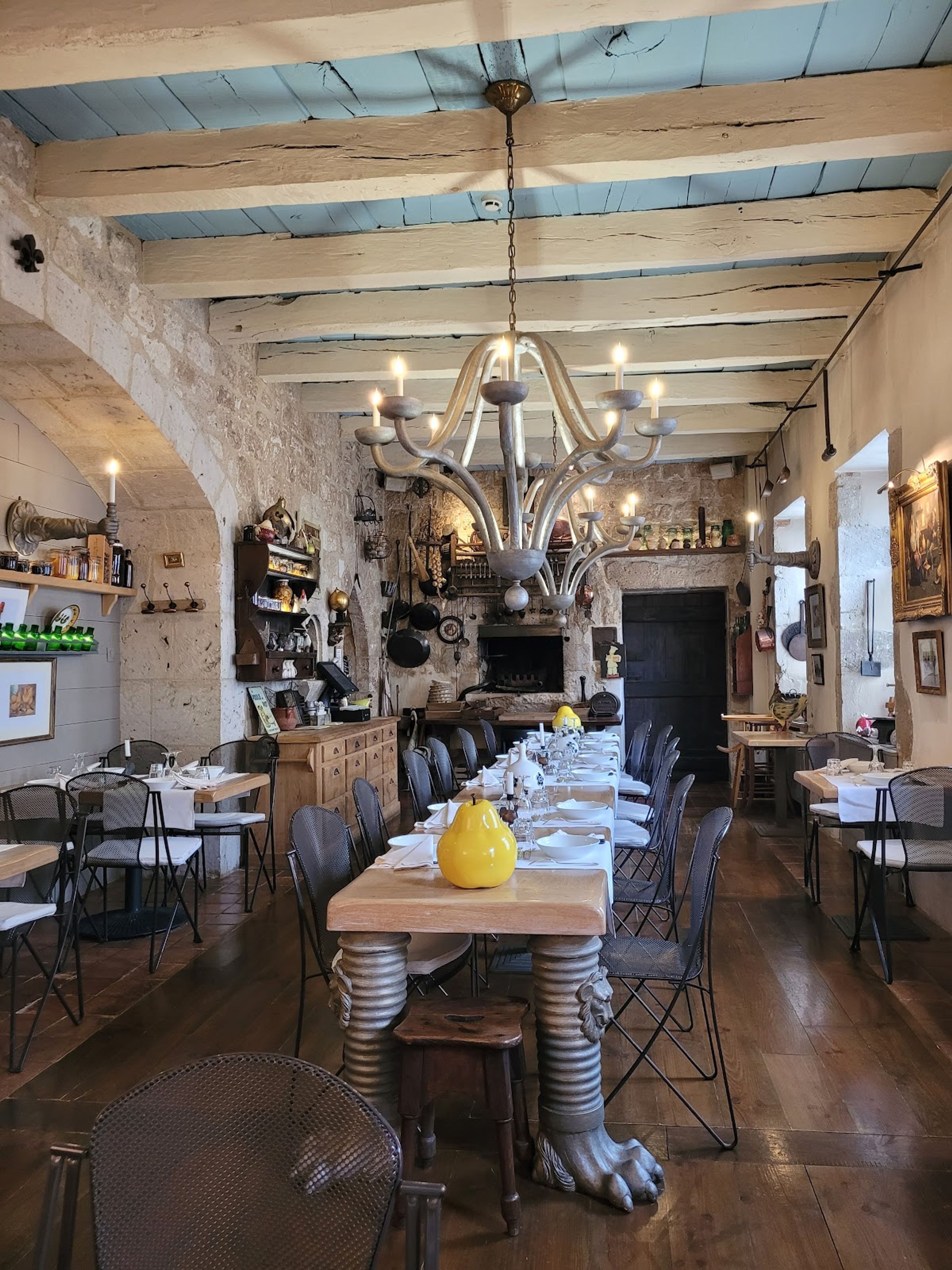 Le restaurant occupe un bâtiment en pierre avec des poutres en bois, des lustres et une table centrale ornée de têtes de lion.
