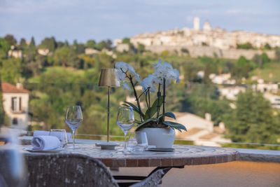Le restaurant sert une cuisine méditerranéenne et provençale avec des ingrédients saisonniers, offrant une vue panoramique sur Saint-Paul de Vence et la côte.