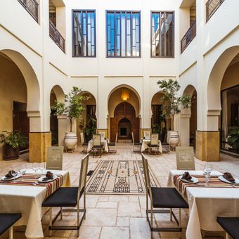 Restaurants établis dans des riads et palais de Marrakech offrant des plats marocains traditionnels et des créations culinaires internationales. Ces adresses présentent la gastronomie locale dans des bâtiments historiques de la médina, avec des terrasses donnant sur la ville et des salles décorées de mosaïques traditionnelles. La carte inclut des tajines, couscous et pastillas ainsi que des spécialités méditerranéennes, asiatiques et européennes.