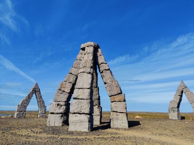 L'Arctic Henge est une installation artistique à Raufarhöfn comprenant quatre portes en pierre alignées sur les points cardinaux. Une colonne centrale se dresse au milieu, surmontée de verre prismatique qui crée des effets de lumière et délimite l'espace entre les portes.