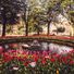Le jardin comprend de nombreuses fontaines et statues réparties le long des allées, entourées de parterres garnis de tulipes et d'arbres matures.