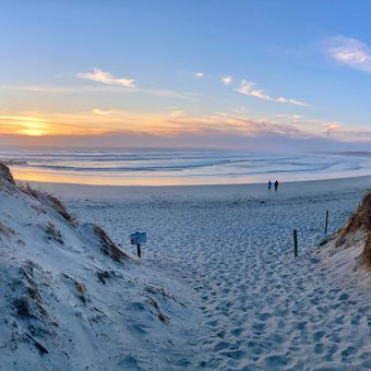 La plage s'étend sur deux kilomètres le long de la côte occidentale avec des dunes de sable blanc et de fortes vagues.