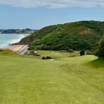 Le parcours de 18 trous s'étend sur 5849 mètres le long des falaises côtières, mêlant des paysages de landes et de plages.