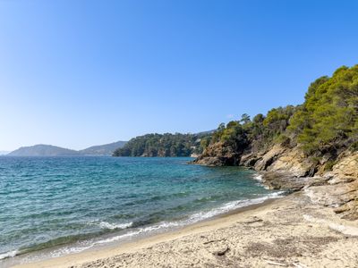 La Plage du Figuier présente une petite crique sablonneuse entourée de végétation naturelle et offre des vues sur les îles du Levant.
