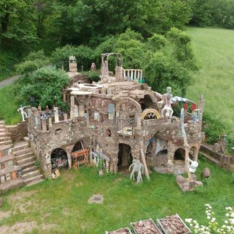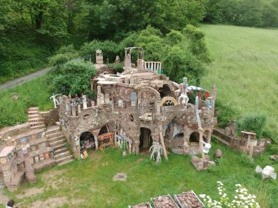 La Construction Insolite présente des voûtes en pierre, des colonnes sculptées, des pièces en fer forgé, des mosaïques et des céramiques surplombant le village.