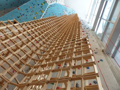 L'établissement dispose de milliers de planchettes en bois identiques permettant de créer des structures atteignant des hauteurs importantes sans supports supplémentaires.