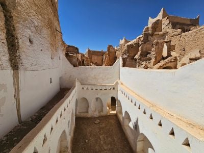 Les maisons de Ghadamès sont construites en terre et en roseaux, avec des murs épais et des passages couverts assurant une température intérieure fraîche.