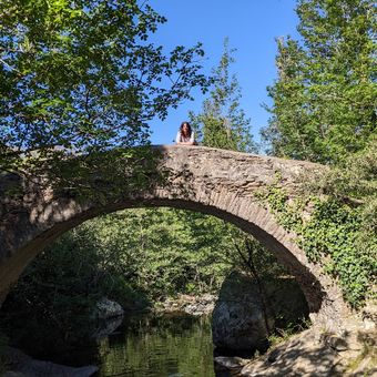 Le pont crée un espace de baignade naturel où le ruisseau forme un petit bassin sous la structure en pierre.