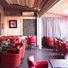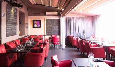 Le restaurant présente un intérieur en noir, blanc et rouge avec des photographies en noir et blanc d'acteurs hollywoodiens sur les murs.