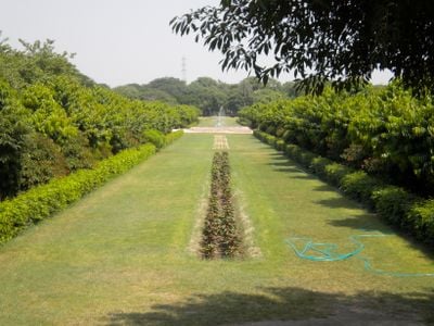 Mehtab Bagh est un complexe jardinal carré sur la rive du Yamuna avec des tours en grès à chaque angle et un réservoir central. Le site s'étend sur une large zone et affiche la structure classique des jardins moghols avec des zones organisées pour les éléments aquatiques et les plantations.