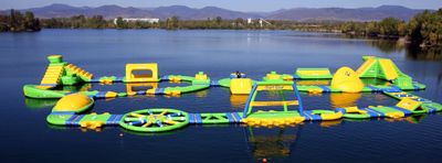 Le parc intègre différents modules aquatiques comprenant des parcours d'obstacles, des pistes de course et des structures d'escalade.