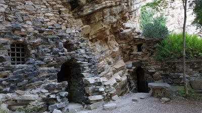 La zone d'entrée contient les vestiges d'un village fortifié avec d'anciens murs, des bâtiments et une chapelle détériorée reflétant les traditions architecturales locales.