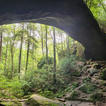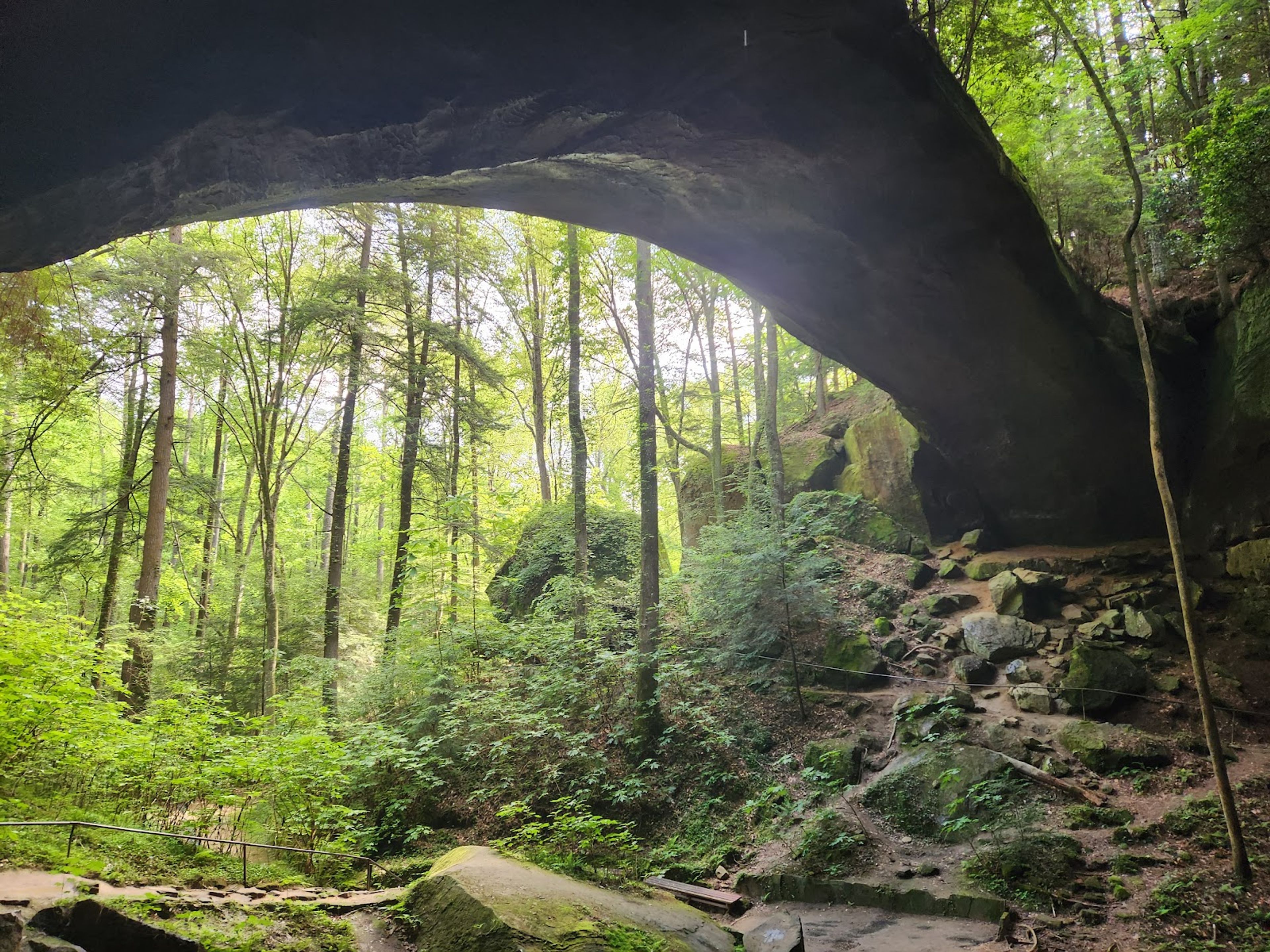 Le pont naturel s'étend sur 148 pieds et atteint 60 pieds de hauteur, constitué entièrement de grès et de minerai de fer formant deux arches.