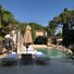 La piscine miroir constitue la pièce maîtresse de la propriété, entourée de cabanes aux rideaux blancs et d'un jardin écologique conçu par Sophie Agatha Ambroise.
