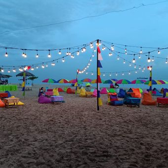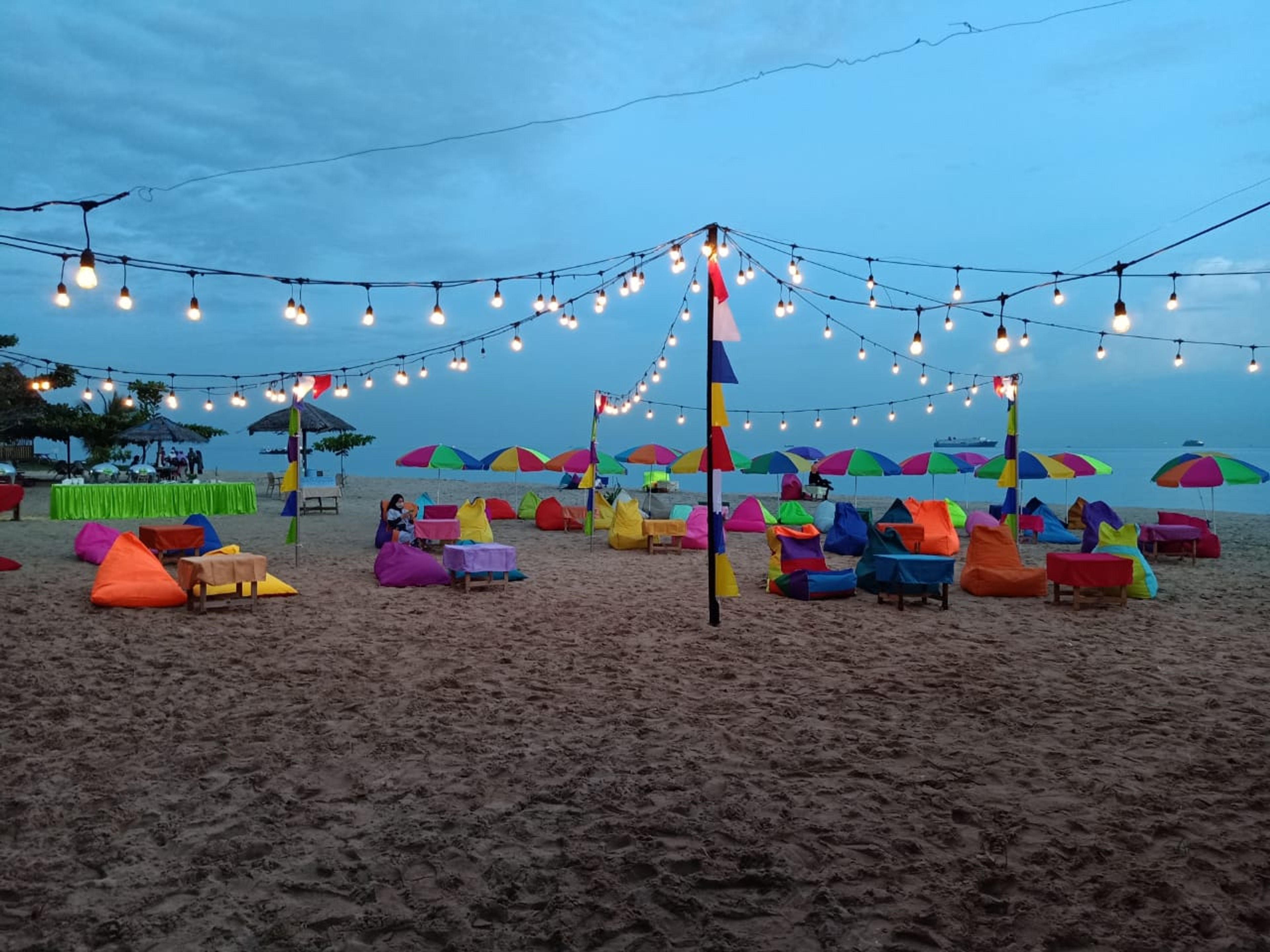 Située à 5 minutes du port de Balikpapan, la plage met à disposition des poufs colorés, des parasols et des tables de pique-nique en service continu.