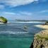 La plage s'étend le long de la côte de Java avec du sable blanc fin bordé de formations rocheuses et des eaux limpides de l'Océan Indien.