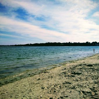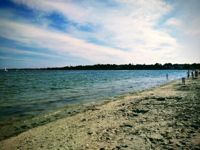 La plage associe une forêt de pins à une pente douce vers l'eau, créant des zones d'ombre naturelle et des conditions de baignade sûres sur toute sa longueur.