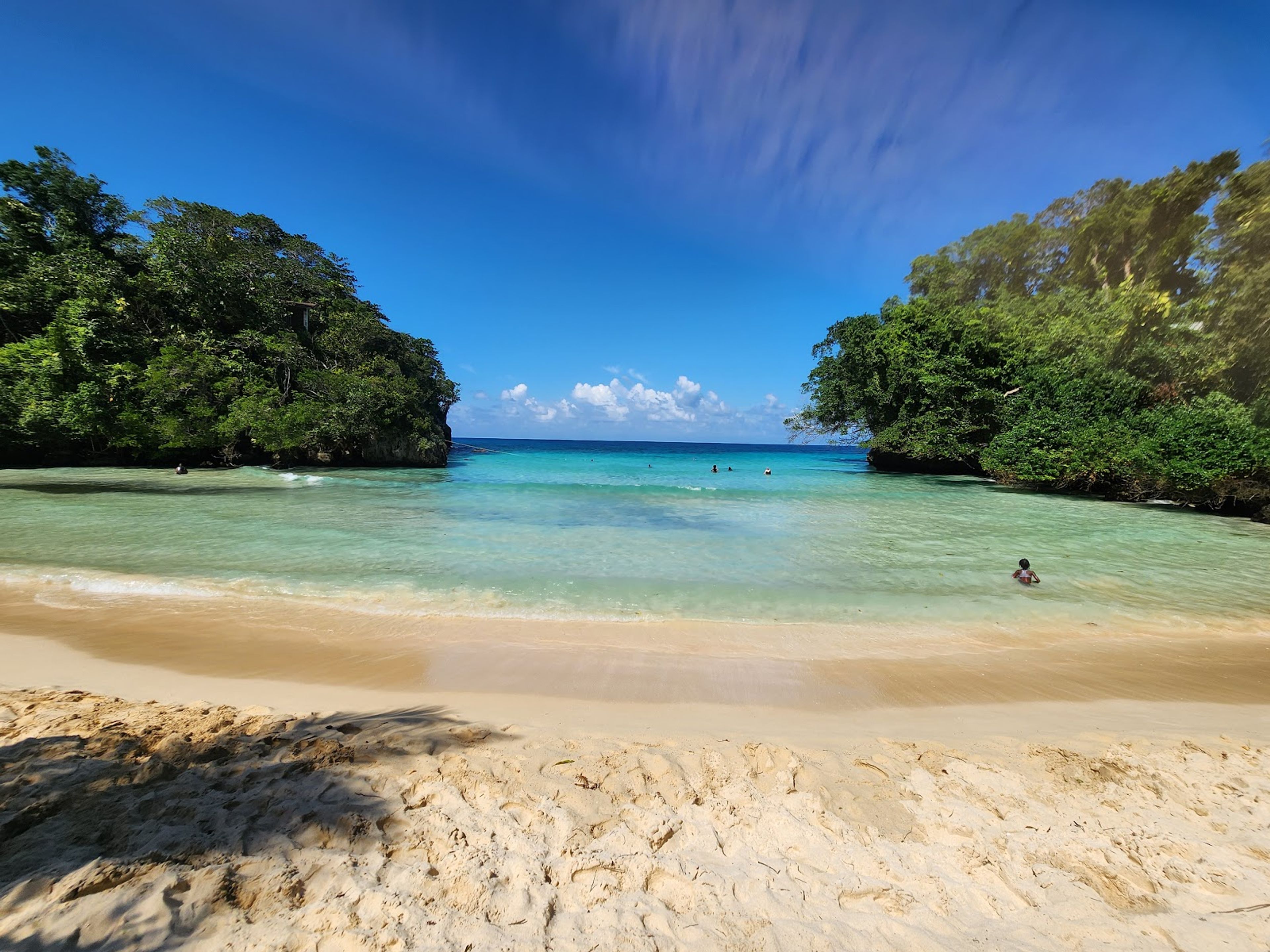 La plage s'étend le long d'une baie incurvée où une rivière d'eau douce des Montagnes Bleues rejoint les eaux de la mer des Caraïbes.