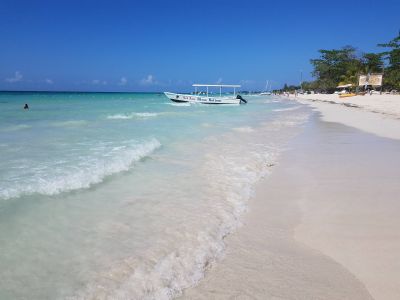 La plage s'étend sur onze kilomètres le long de la côte ouest de la Jamaïque, offrant des rivages de sable blanc et des eaux caribéennes transparentes.