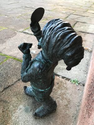 Kandarek représente la tradition de l'art urbain de Wrocław, où des nains en bronze commémorent des lieux et des activités dans toute la municipalité.