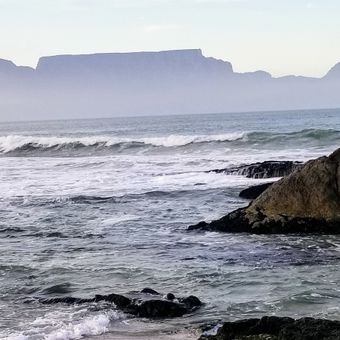 Le littoral s'étend le long de la baie de Table, présentant des sables blancs et des eaux limpides face à la Montagne de la Table.