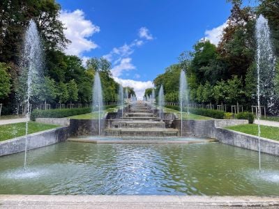 Le parc de 184 hectares présente des jardins symétriques, des canaux, des fontaines, des allées bordées d'arbres et des parterres sur plusieurs niveaux.