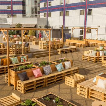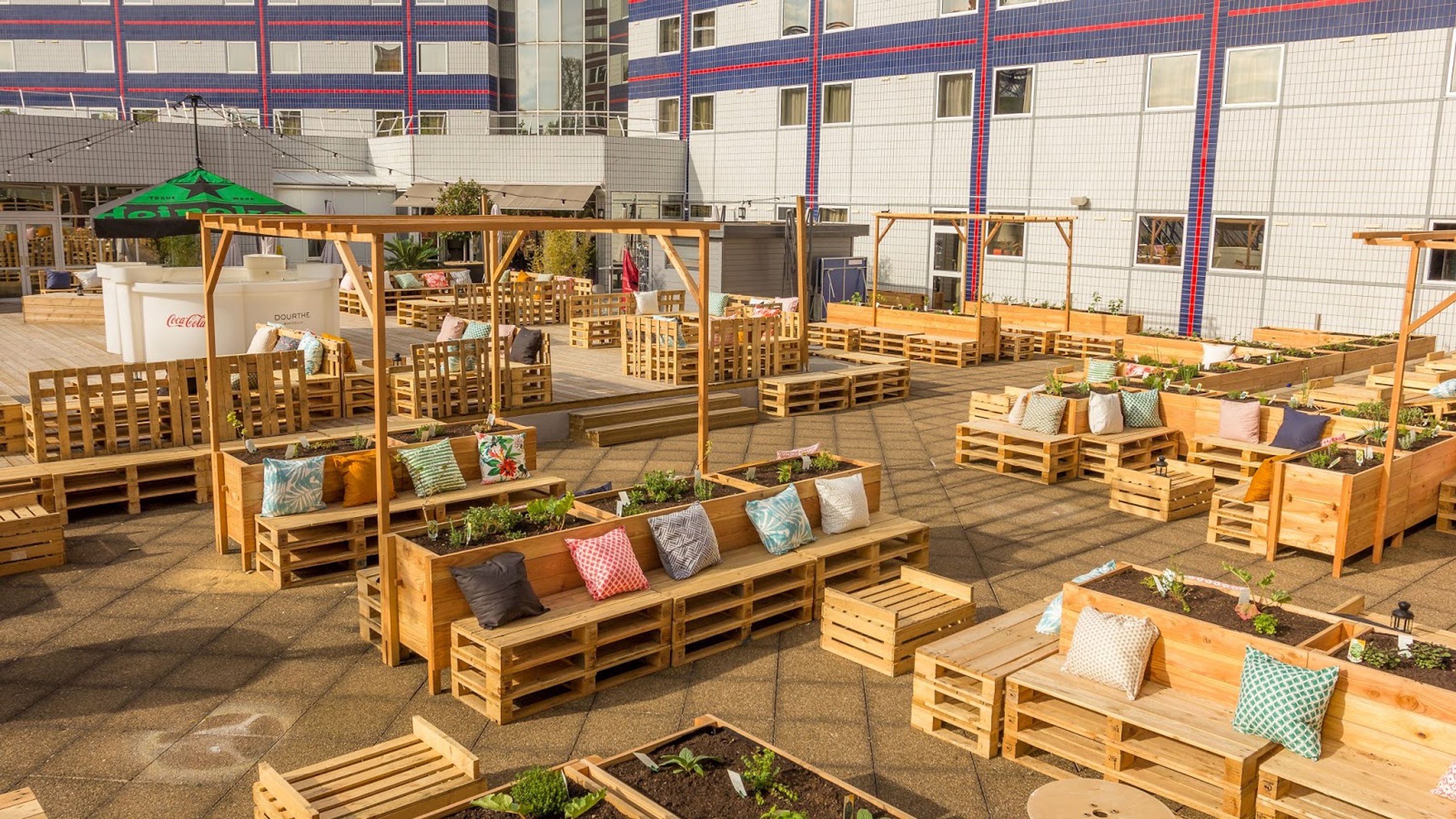 Le Papa Cabane s'étend sur une terrasse de 1000 mètres carrés avec des palmiers, des pergolas et des transats au cœur du 12ème arrondissement de Paris.