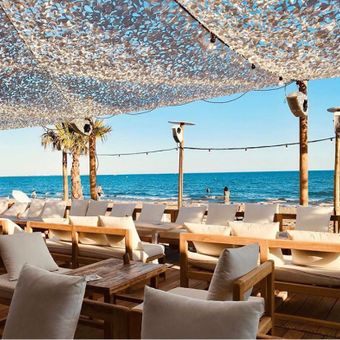 Le restaurant La Paillote Bambou propose une vue directe sur la mer Méditerranée depuis sa terrasse située sur la plage du Couchant.