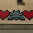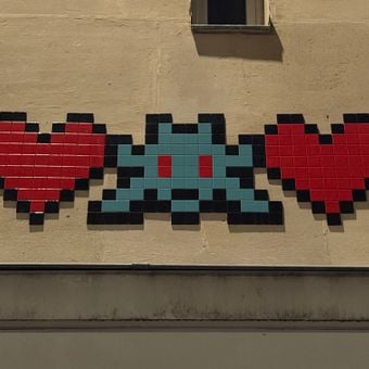 Cette mosaïque d’Invader montre une créature bleue placée entre deux grands cœurs rouges, réalisée avec des carreaux carrés sur un mur beige.