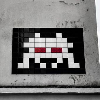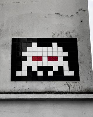 Un petite carreau blanc et noir est fixé à un mur de Paris : un Space Invader aux yeux rouges qui vous regarde. Cet alien pixelisé fait partie d'une chasse au trésor urbaine lancée par un artiste anonyme dans les années 2000. Des centaines de ces créatures en mosaïque se cachent dans la ville. Celui-ci vous attend au coin d'une rue ordinaire, facile à manquer si vous ne levez pas les yeux. Chaque Space Invader sur les murs parisiens raconte une petite histoire personnelle : l'artiste note chaque position, chaque découverte devient un moment de confiance entre lui et celui qui la trouve. C'est une invitation discrète à voir Paris autrement, à regarder au-delà de ce qui est au niveau des yeux, et à transformer une promenade simple en un jeu de détective urbain.