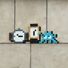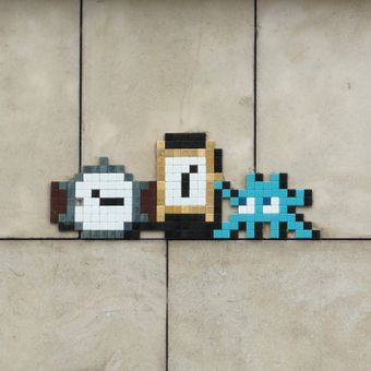Cette œuvre d’Invader montre trois éléments : une horloge ronde blanche à bords marron, une horloge rectangulaire beige avec un chiffre un noir et une créature pixelisée bleue, toutes créées avec de petits carreaux carrés.