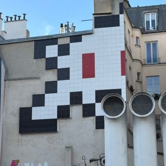Cette grande mosaïque représente une créature extraterrestre en forme de pixel, faite de carreaux noirs, blancs et rouges, qui forme un intrus avec deux yeux rouges.