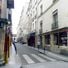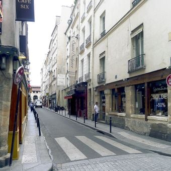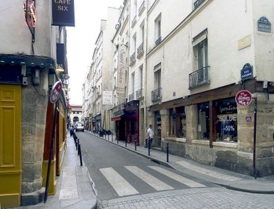 Une petite mosaïque avec une créature bleue composée de carreaux carrés sur un fond rouge, installée dans un mur en pierre au 21 Rue des Canettes. La forme représente une figure simple avec des bras, des yeux et des jambes en bleu et rouge.