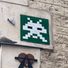 Cette mosaïque d’Invader montre une créature blanche avec des bras et des antennes sur un fond vert. Les carreaux forment un motif carré simple.
