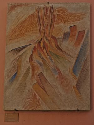 Abstract composition, painting in the Arcumeggia open-air mural gallery, Casalzuigno, Italy, by Marino Ferrari, 1964