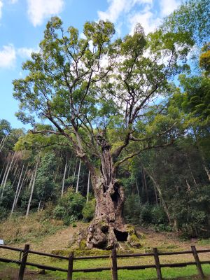L'arbre est estimé à environ trois mille ans, ce qui en fait l'un des plus anciens du Japon. Le Sanctuaire Takeo a été établi il y a environ mille trois cents ans et a gagné en importance par son association avec le chef de guerre Minamoto no Yoritomo, qui aurait prié ici au douzième siècle avant de remporter une bataille décisive.