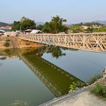 Le Pont Mương Thạnh est une structure étroite en béton et acier qui traverse la rivière Nậm Rốm à Dien Bien Phu. Il possède des rampes métalliques simples des deux côtés et sert les piétons et les véhicules chaque jour.
