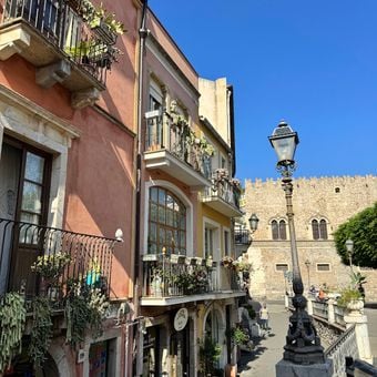 Porta Messina est une arche de pierre a l'entree nord de la vieille ville de Taormina qui marque le debut de la rue principale. La structure affiche les armoiries Bourbon sur sa cle de voute et mene directement a Corso Umberto, une rue bordee de magasins, cafes et batiments historiques.