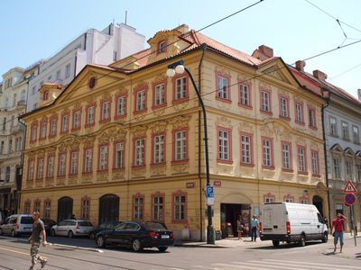 Le palais Schirdingovský se dresse à l'intersection de Národní třída et de la rue Mikulandská, présentant des éléments architecturaux néoclassiques et baroques.
